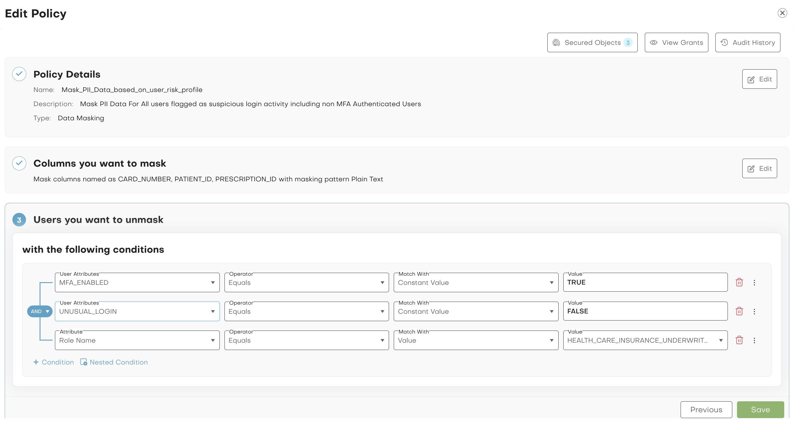 TrustLogix supports policy-based, attribute-based, and relationship-based access controls, allowing policies to consider user identity attributes, sensitivity classifications, geography, purpose of use, and real-time risk scores. By combining these fine-grained access controls with continuous monitoring, organizations can implement adaptive policies that respond instantly to risk signals and maintain secure, continuous data access across the environment.
